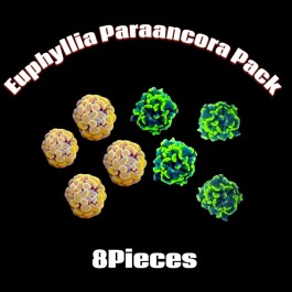 The Euphyllia Paraancora pack consists of 8 stunning coral pieces, featuring 4 in vibrant gold/orange and 4 in striking green two-tone colors.