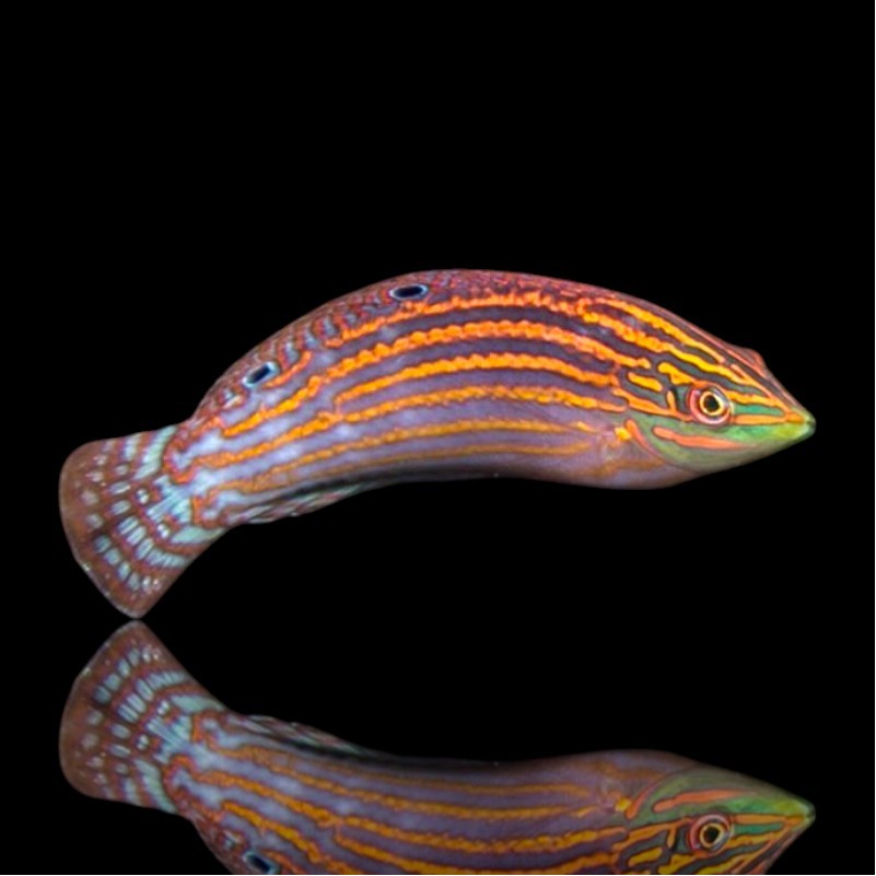 The Adorned Wrasse is an ornate, vibrantly-colored wrasse brimming with personality. This two-spotted beauty boasts iridescent tangerine stripes across a bluish green body giving the Adorned Wrasse a striking appearance. The contrasting color combination and intricate markings of the Adorned Wrasse inject exceptional visual interest to any marine aquarium. In fact, under the "right" lighting conditions mature Adorned Wrasses appear to glow a fiery orange for a fantastic and unexpected visual effect.